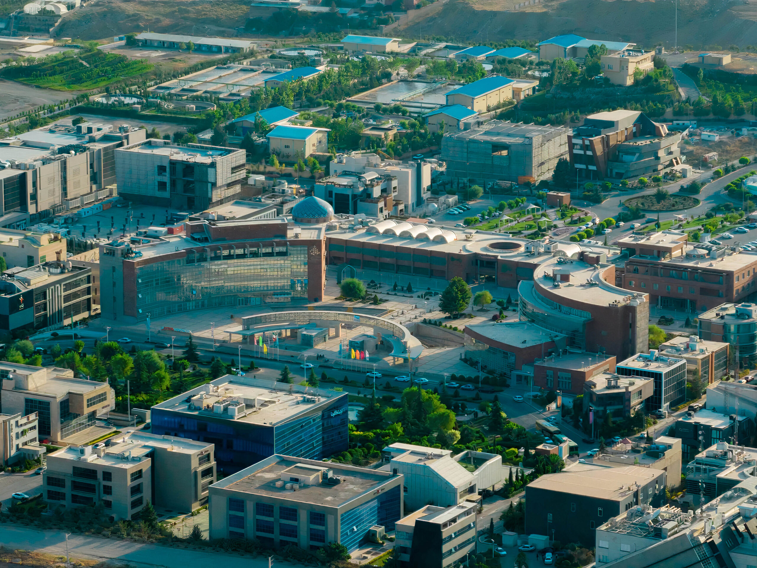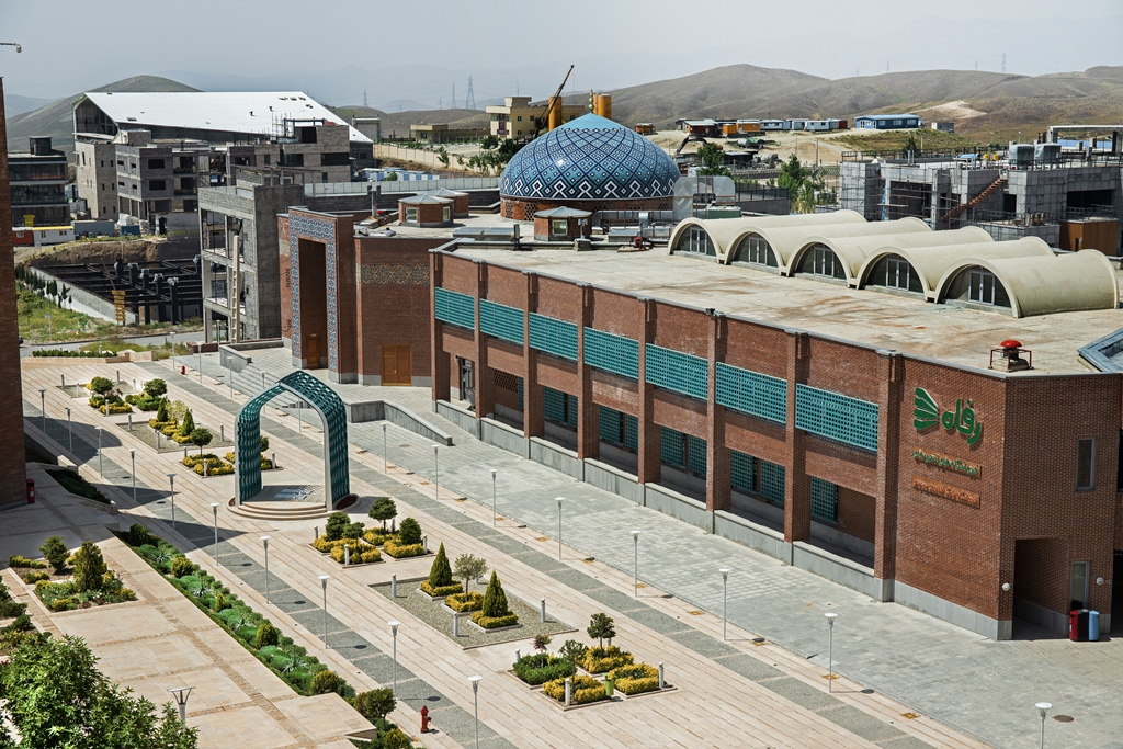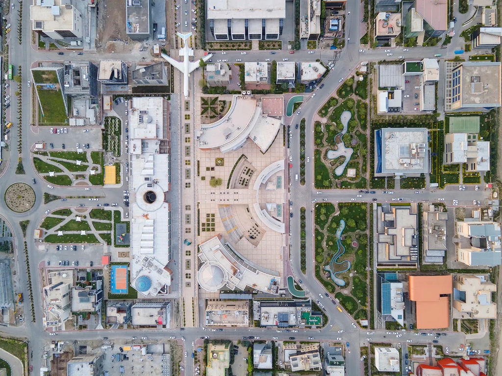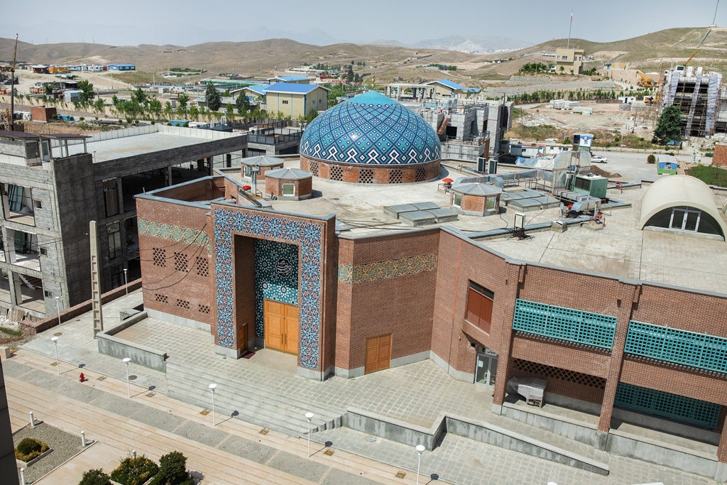 نمای هوایی از مجموعه پارک علم و فناوری پردیس و مسجد مجموعه؛ نمادی از همنشینی هویت معماری سنتی ایرانی با مرکزیت نوآوری و تکنولوژی مدرن.