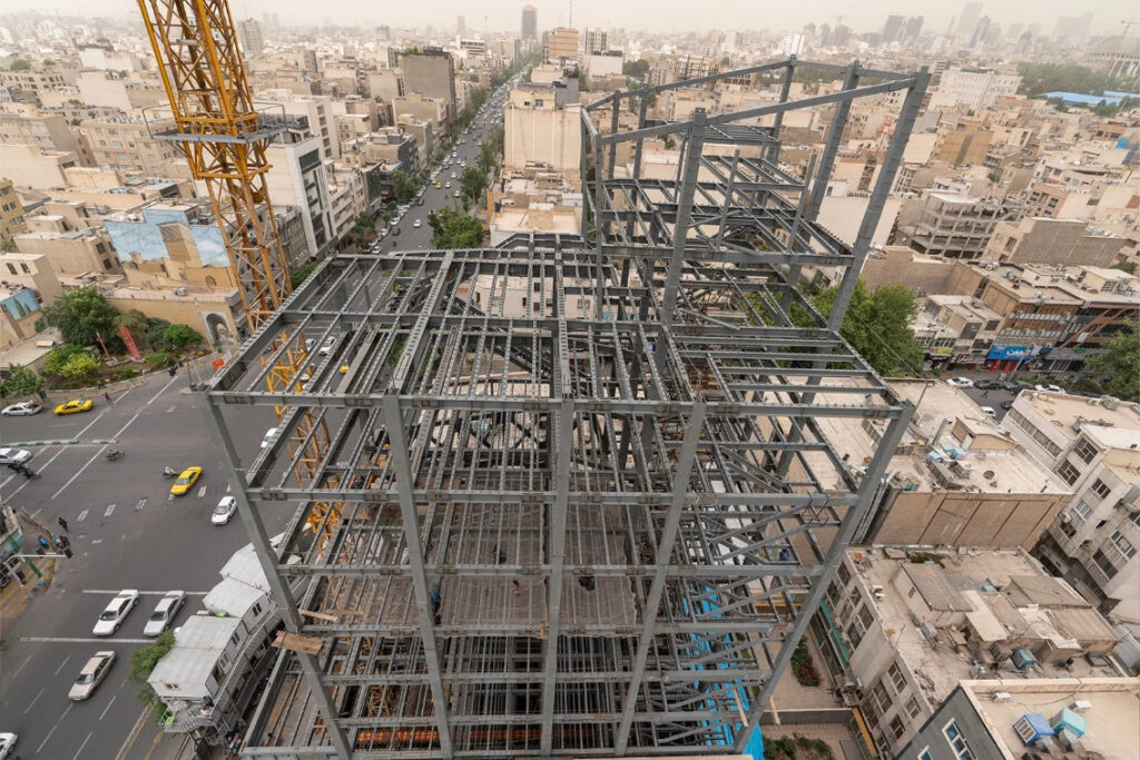 اسکلت فولادی پروژه اداری-تجاری تخت طاووس در خیابان مطهری، که بیانگر دقت فنی در طراحی سازه و اجرای سیستم قاب خمشی فولادی متوسط است.