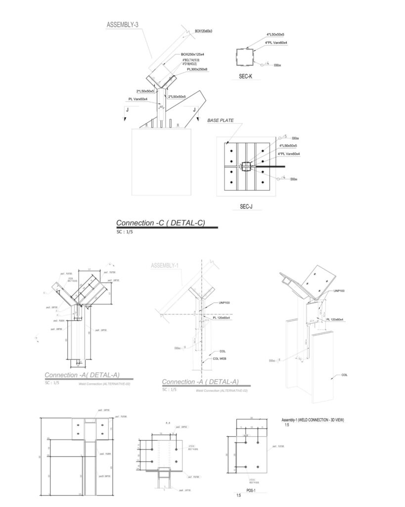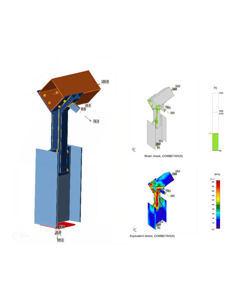 طراحی اتصالات ویژه و تحلیل اجزای محدود: طراحی و جزئیاتبندی اتصالات بر اساس شرایط ساخت و محدودیتهای نصب در ارتفاع. همچنین، انجام تحلیل اجزای محدود (Finite Element Analysis) برای کنترل مؤثر تنشها و انتقال