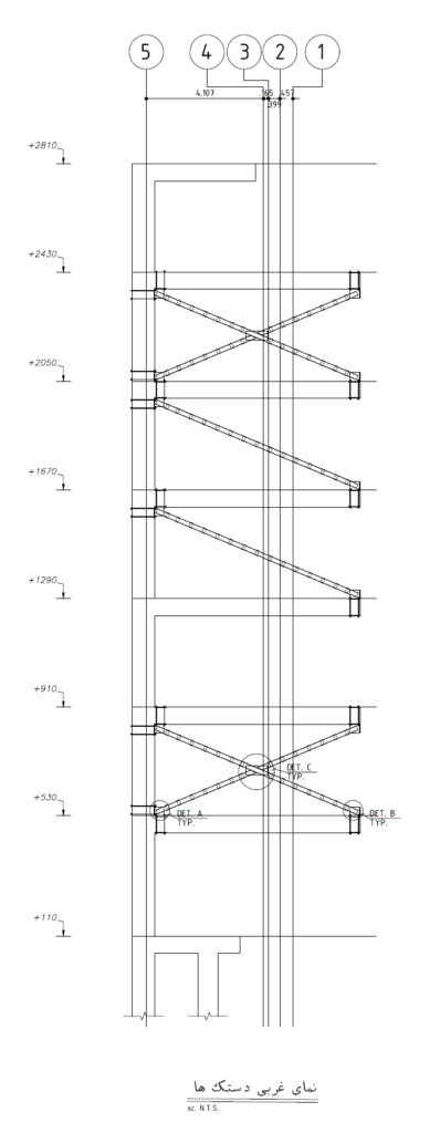 استفاده از سیستم دستک (Cantilever Support) برای مهار بارهای ثقلی و جانبی در بخشهای معلق نما، با دقت محاسباتی بالا.