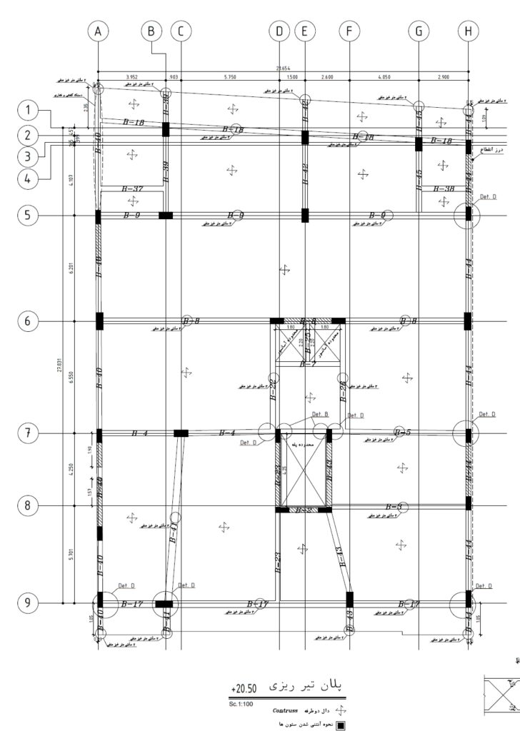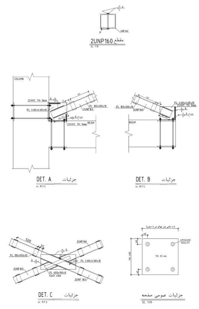 دقت در اتصالات: جزئیات فنی (DET A, B, C) نشاندهنده استفاده از ورقهای اتصال ضخیم و جوشهای نفوذی برای مهار نیروی کششی و فشاری در دستکها است.