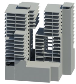 - هندسه نامنظم در پلان: پلان پروژه نشاندهنده یک طراحی غیرمتعارف در محدوده برج شرقی و غربی است که نیازمند تحلیلهای لرزهای پیشرفته برای جلوگیری از پیچش سازه بود.